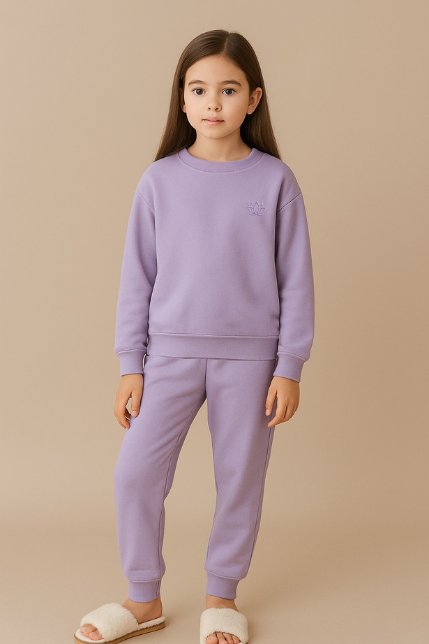Soft cotton pajama set in calming lavender tones, perfect for playing and sleeping year-round.