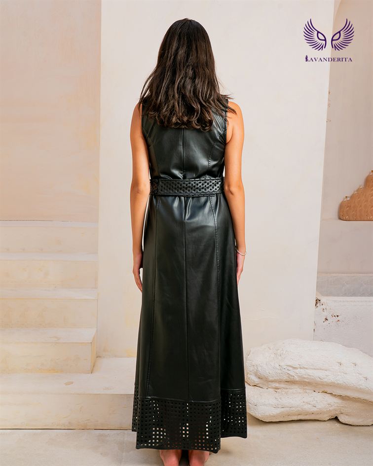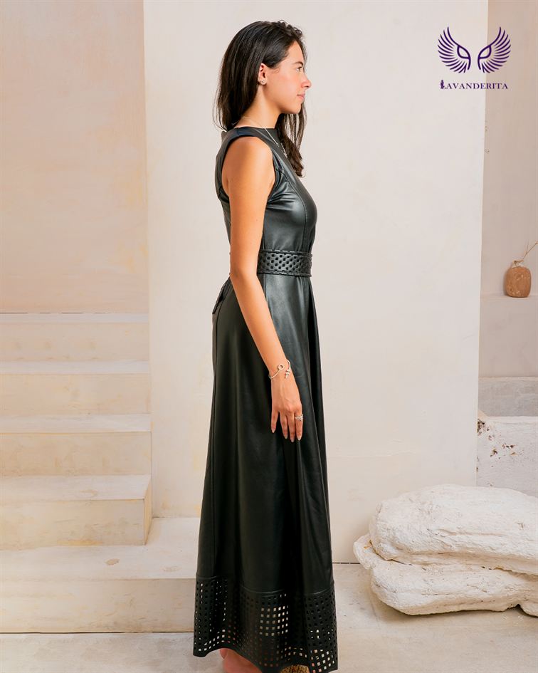 Sleeveless leather dress made of genuine leather with a velvet lining to suit winter weather and a belt at the waist.
