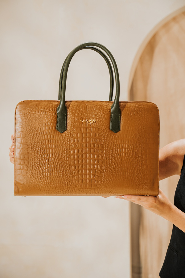 Made from genuine cowhide leather with a crocodile pattern. Accented with gold-tone metal accessories.