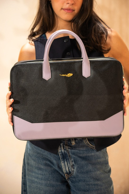 A stylish and modern laptop handbag featuring an elegant dual-tone design in black and lavender.