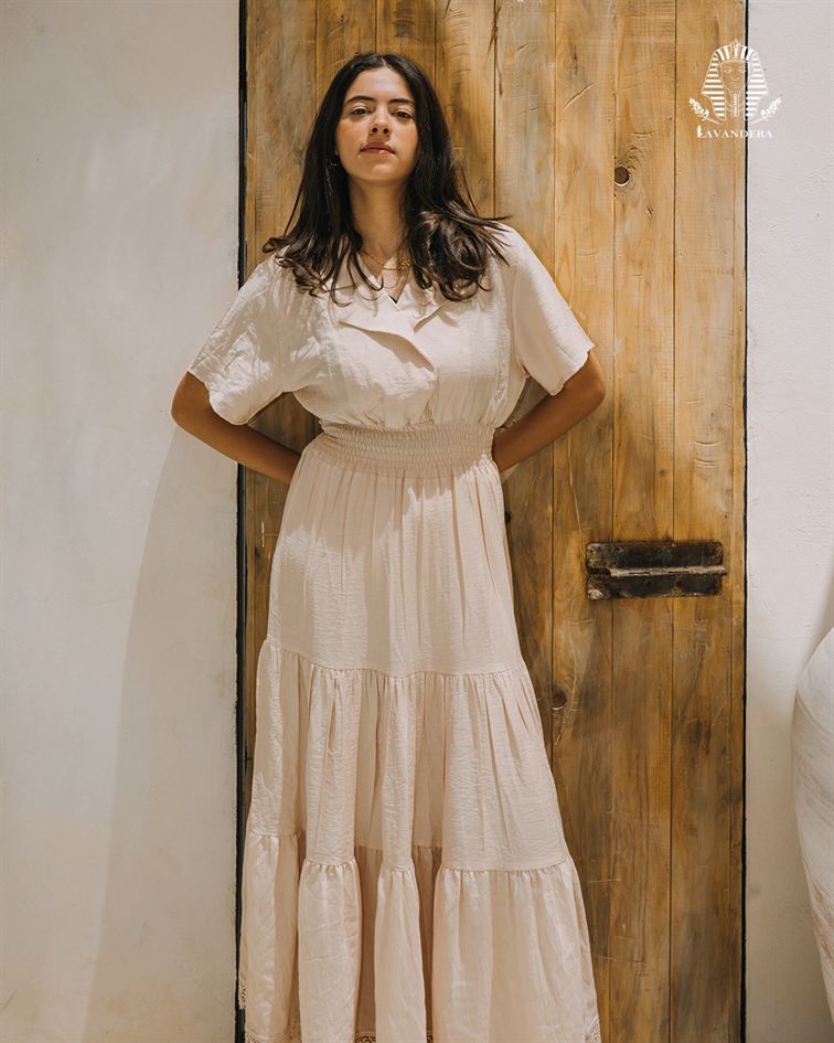 A dress made of pure linen, treated against shrinkage and wrinkles, and treated against fungi and bacteria.